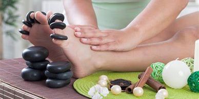 Combining deep relaxing massage of lower legs using heated basalt stones and heavenly scented massage oil.